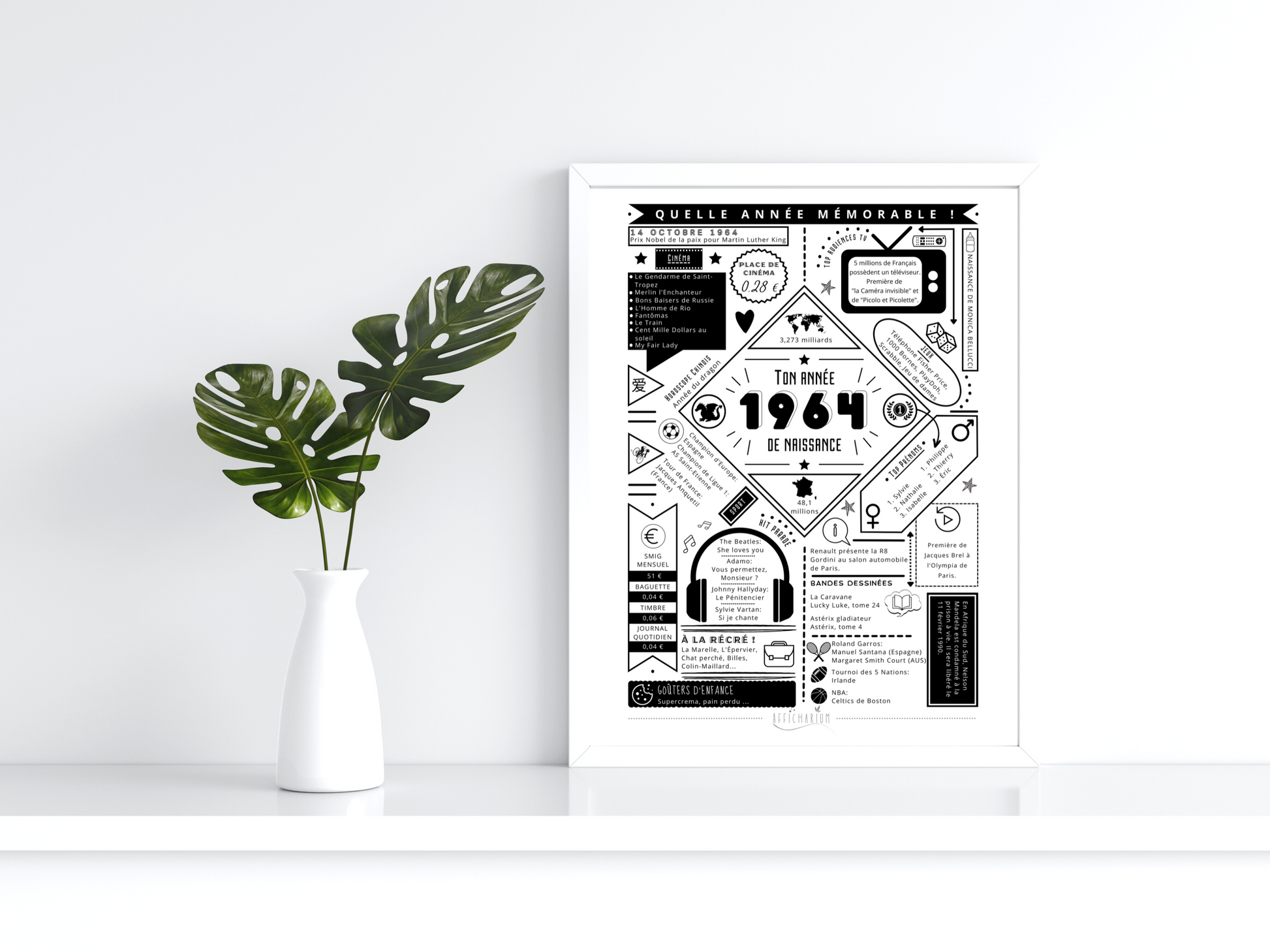 Avec cette affiche "ton année de naissance" 1964, offrez un souvenir des faits marquants de l'année de naissance de la personne que vous souhaitez surprendre !