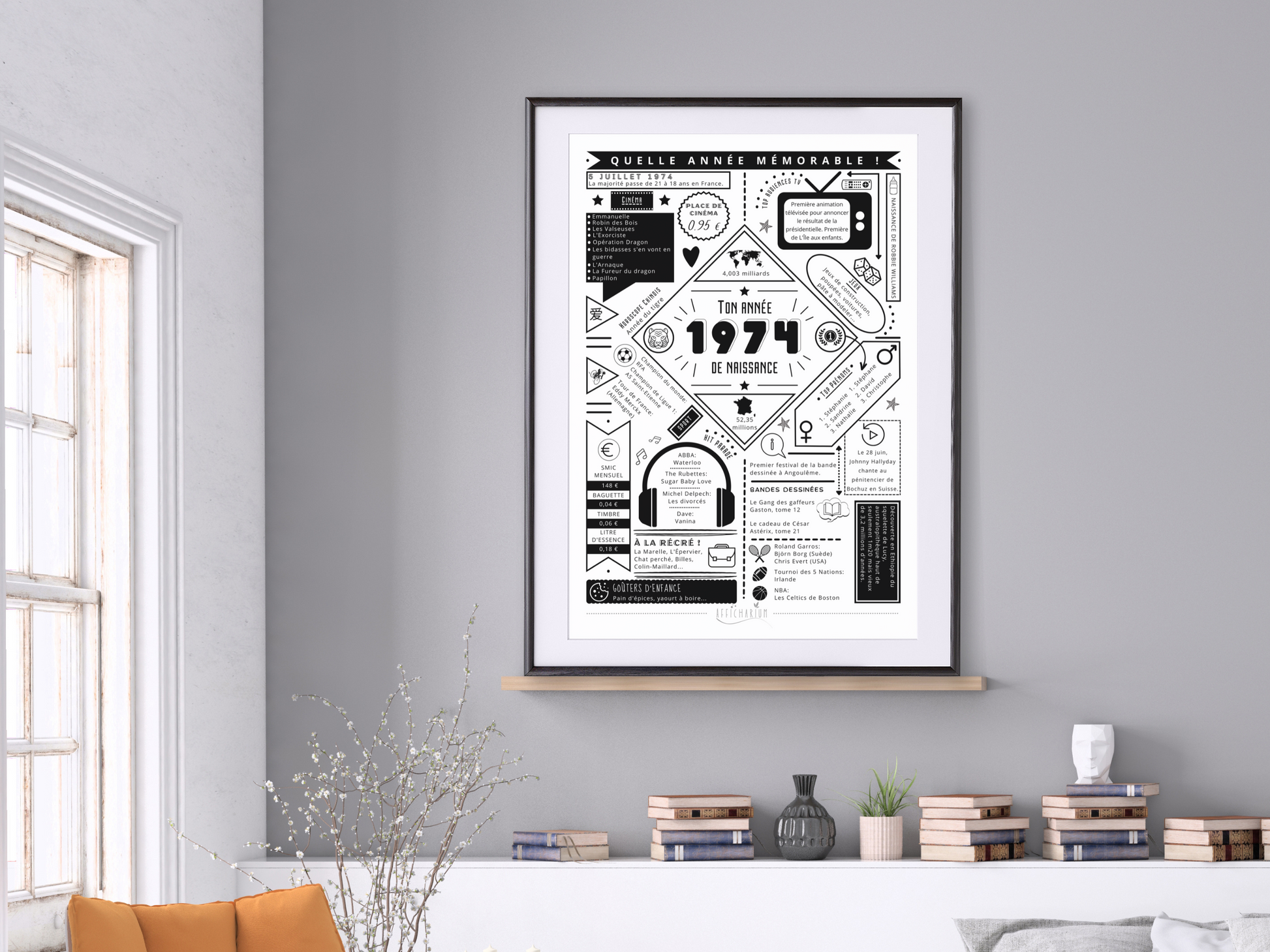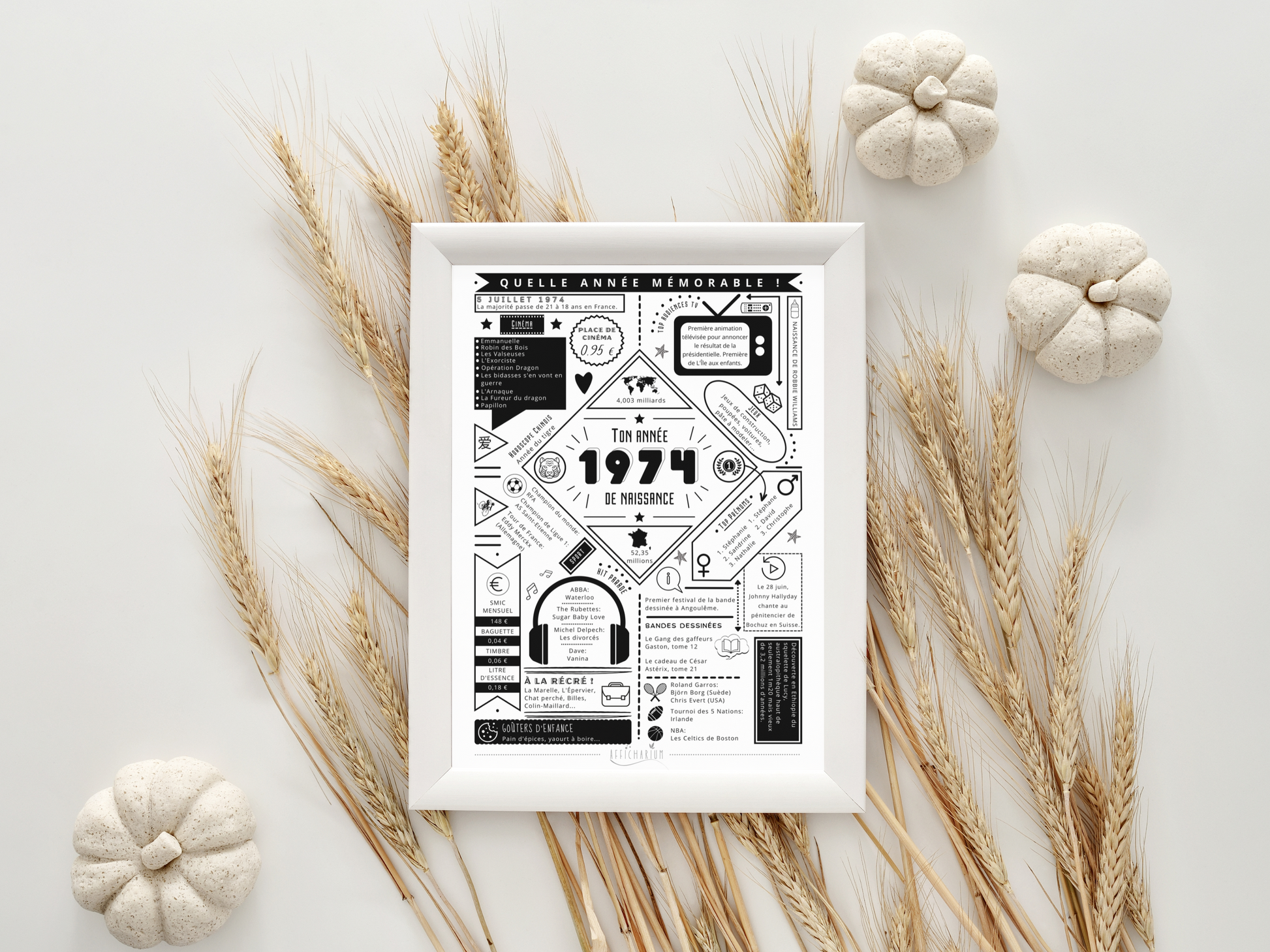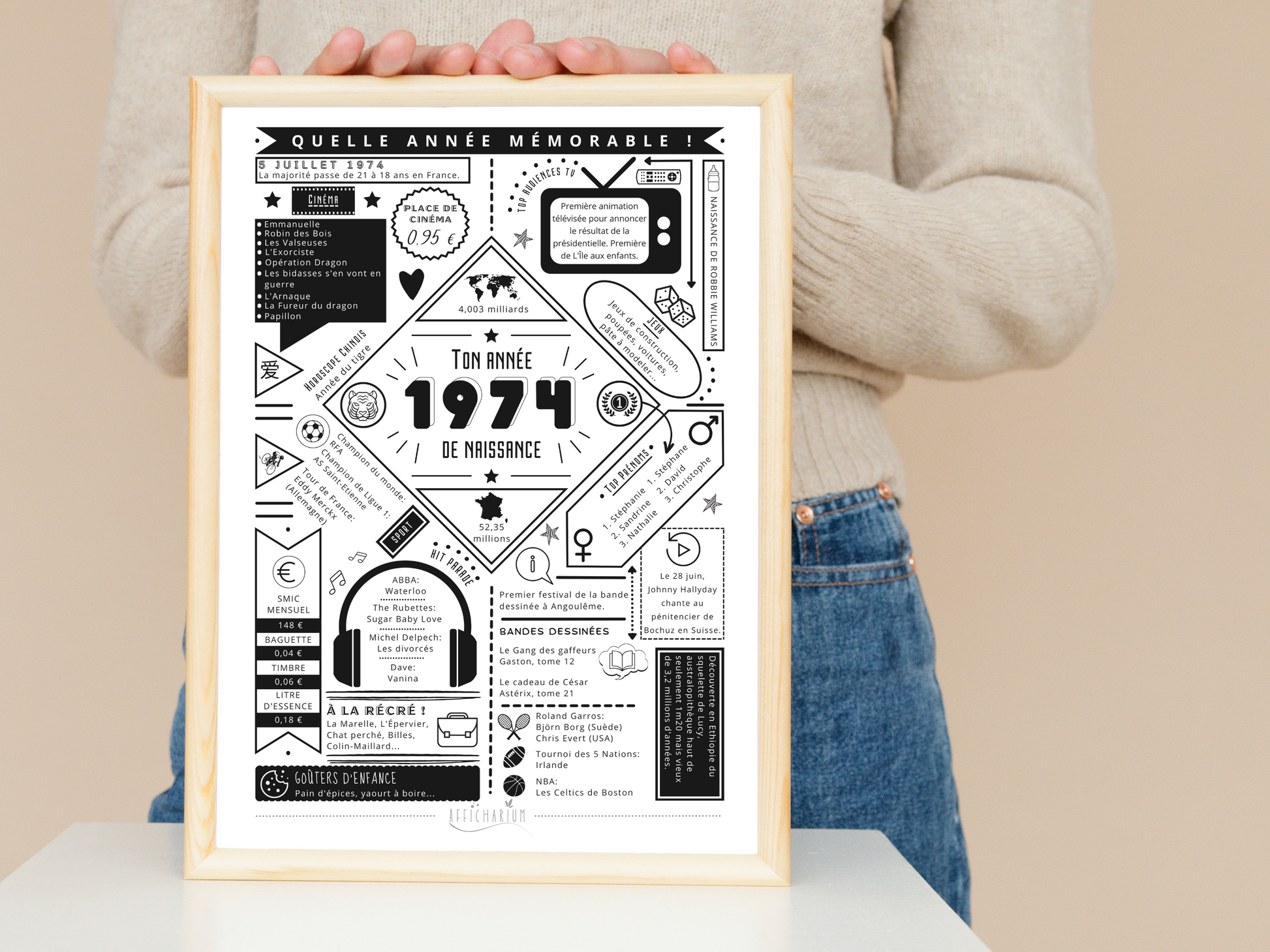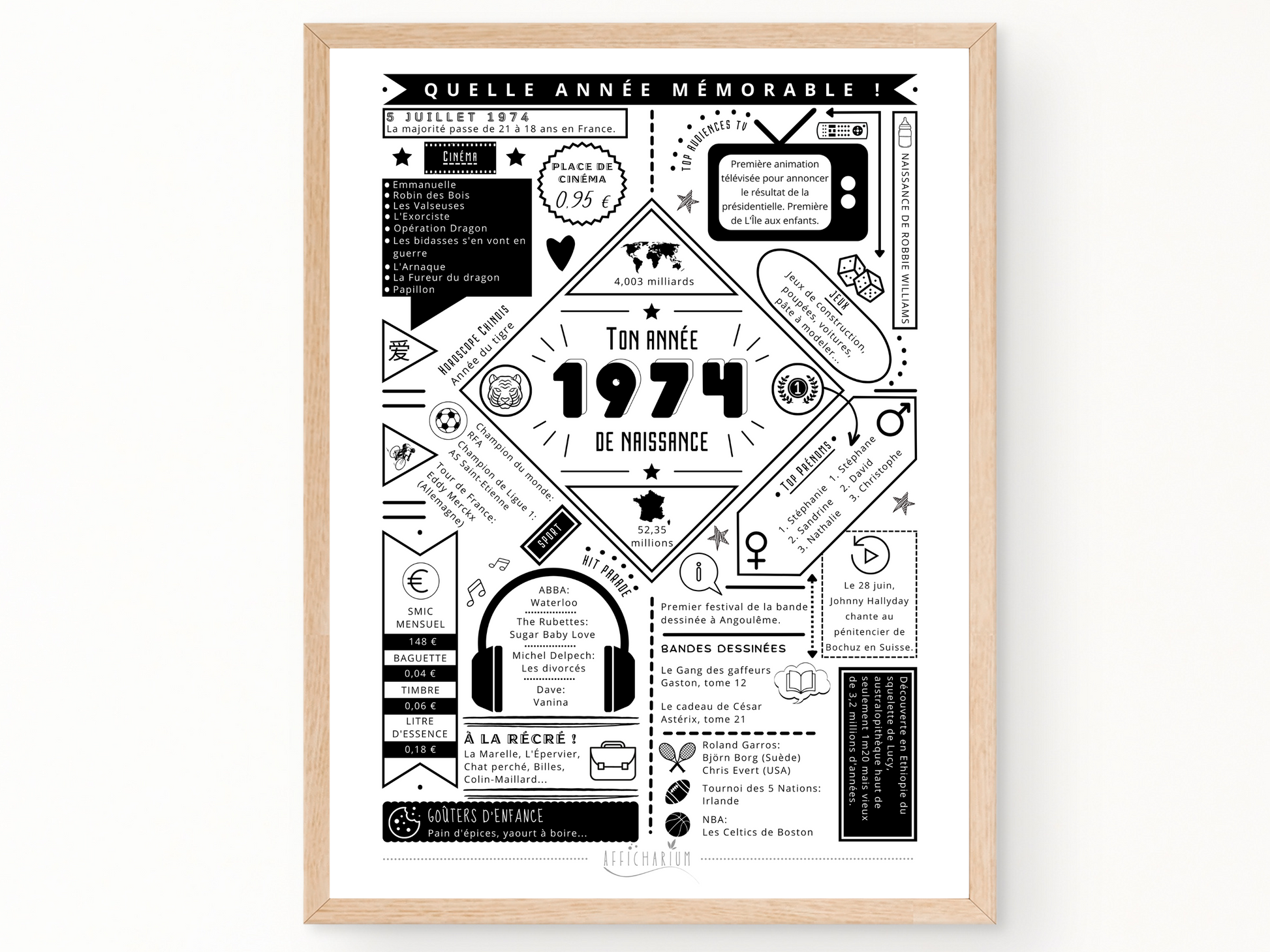 Avec cette affiche "ton année de naissance" 1974, offrez un souvenir des faits marquants de l'année de naissance de la personne que vous souhaitez surprendre !