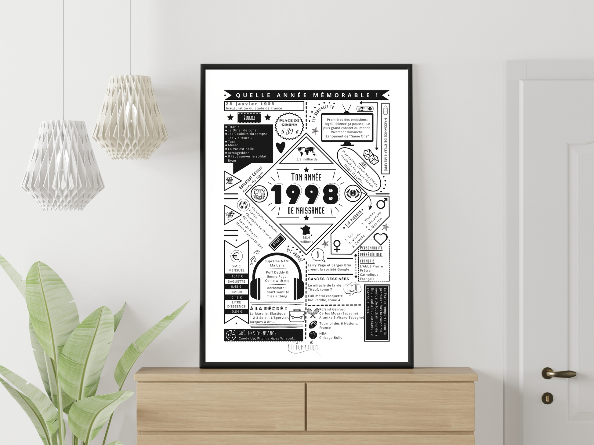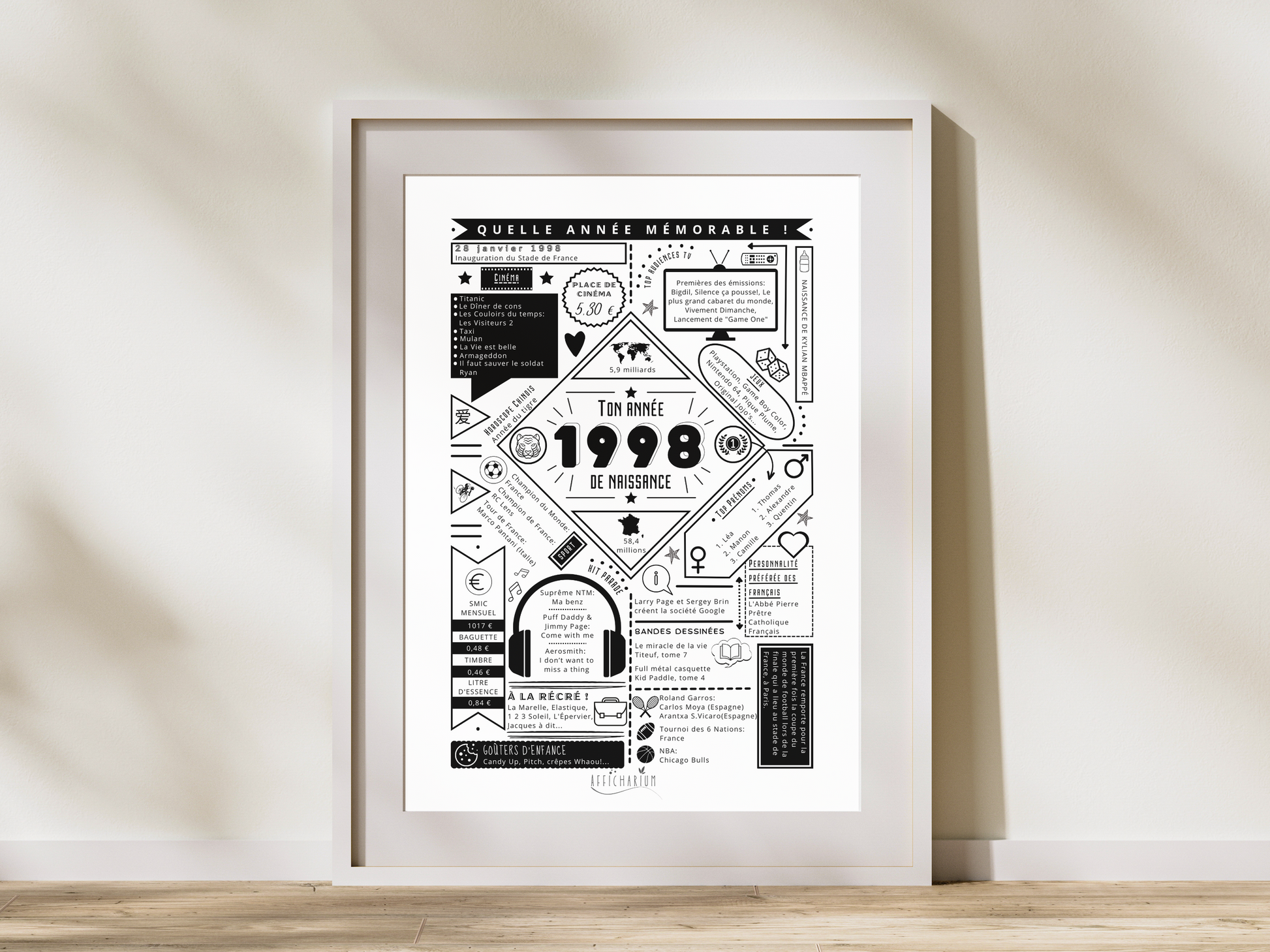 Avec cette affiche "ton année de naissance" 1998, offrez un souvenir des faits marquants de l'année de naissance de la personne que vous souhaitez surprendre !