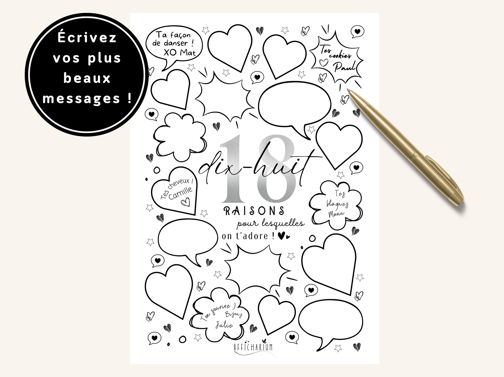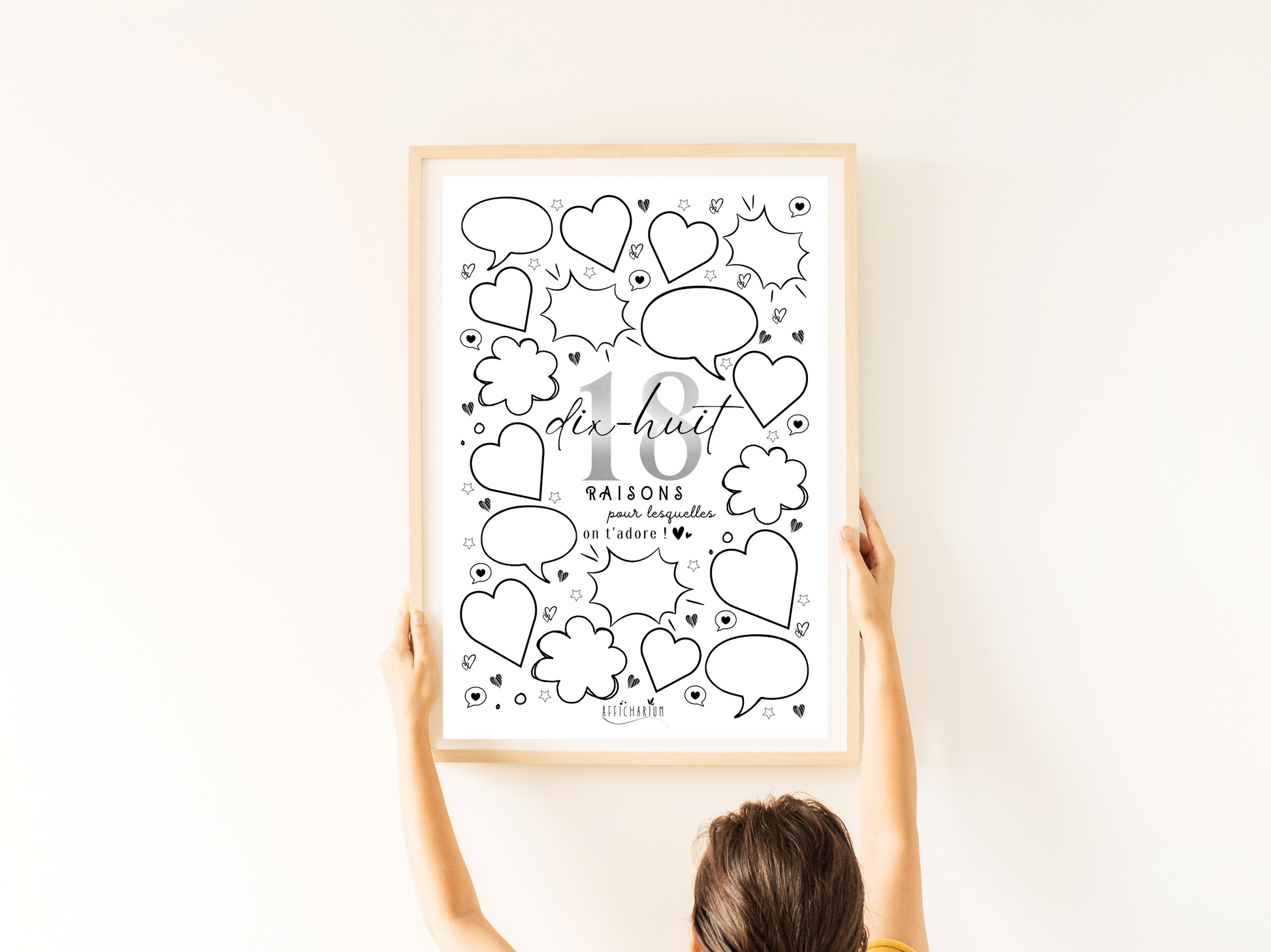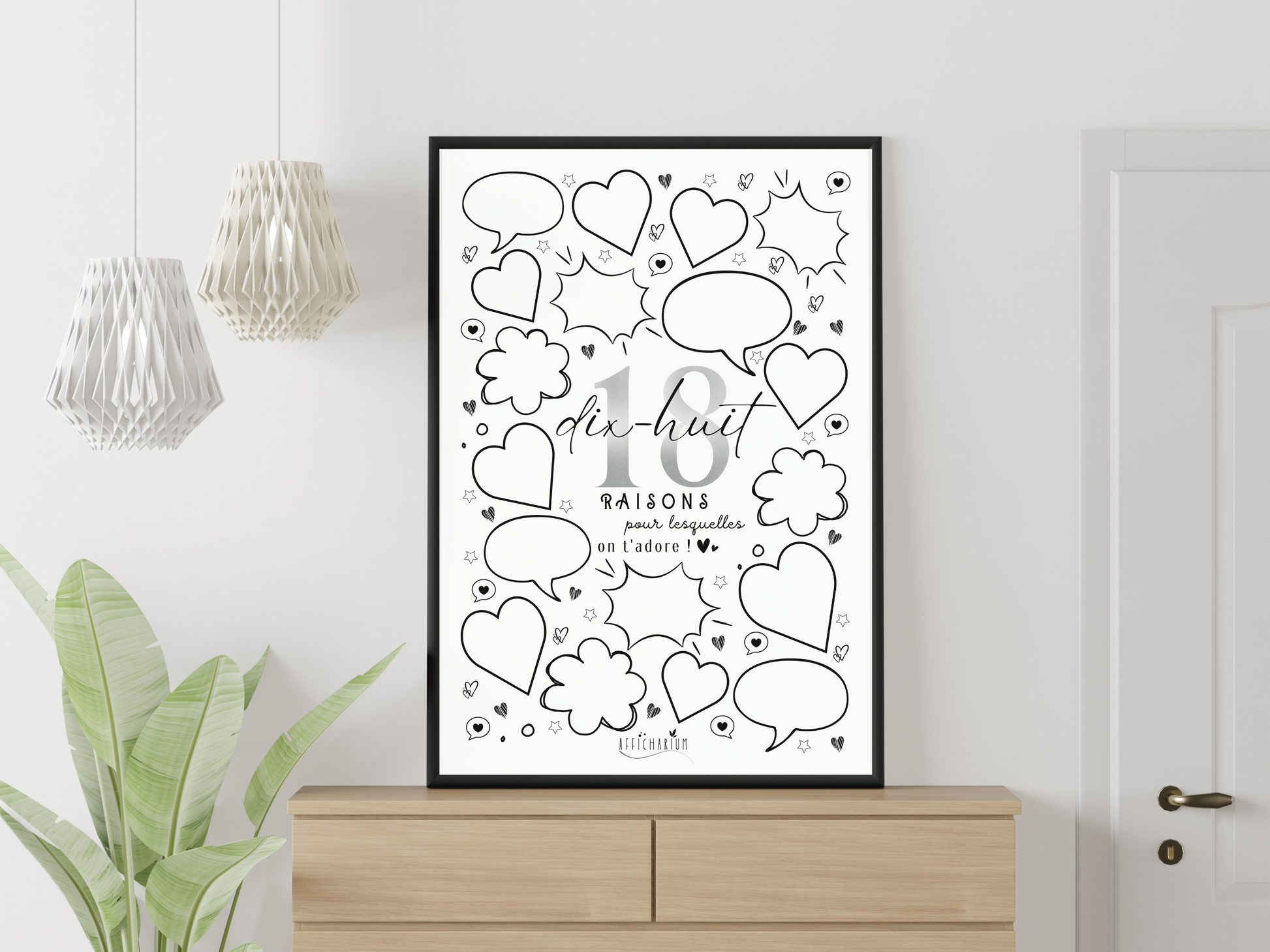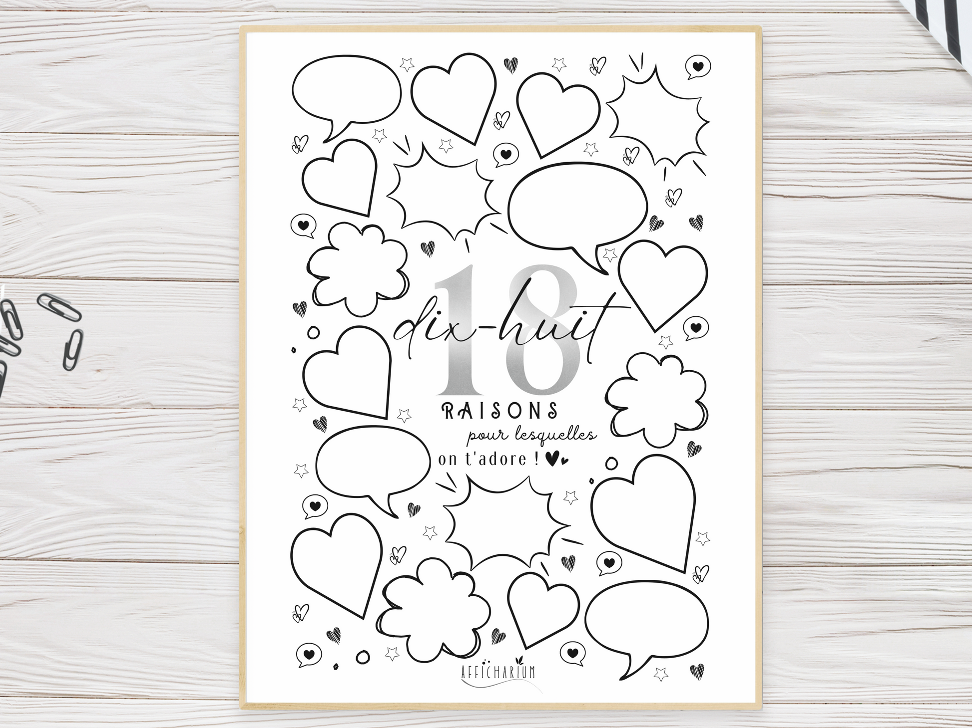 Cette affiche est remplie de coeurs et bulles à signer par tous les invités et à offrir à la personne qui fête son 18ème anniversaire une fois entièrement dédicacée.