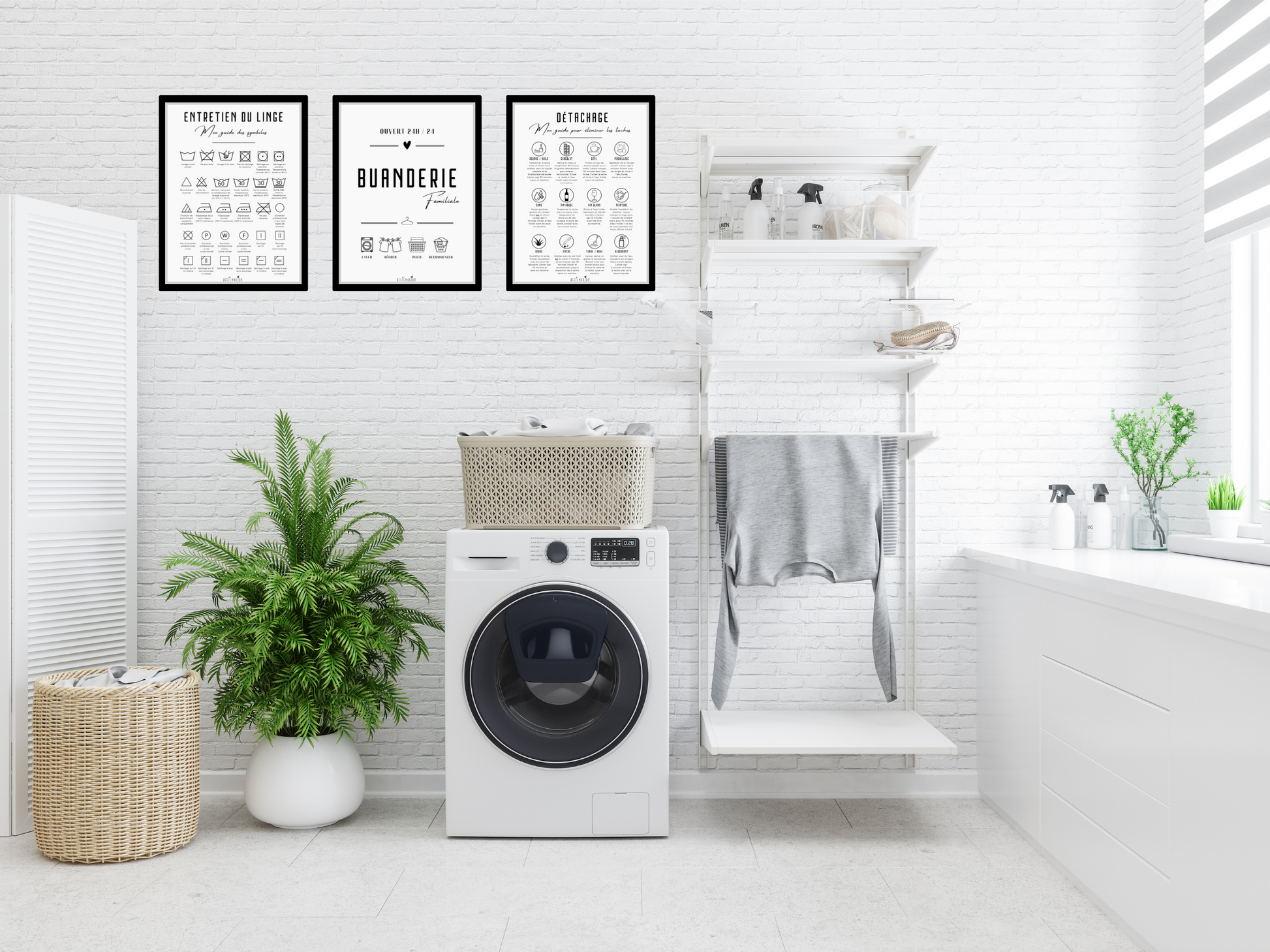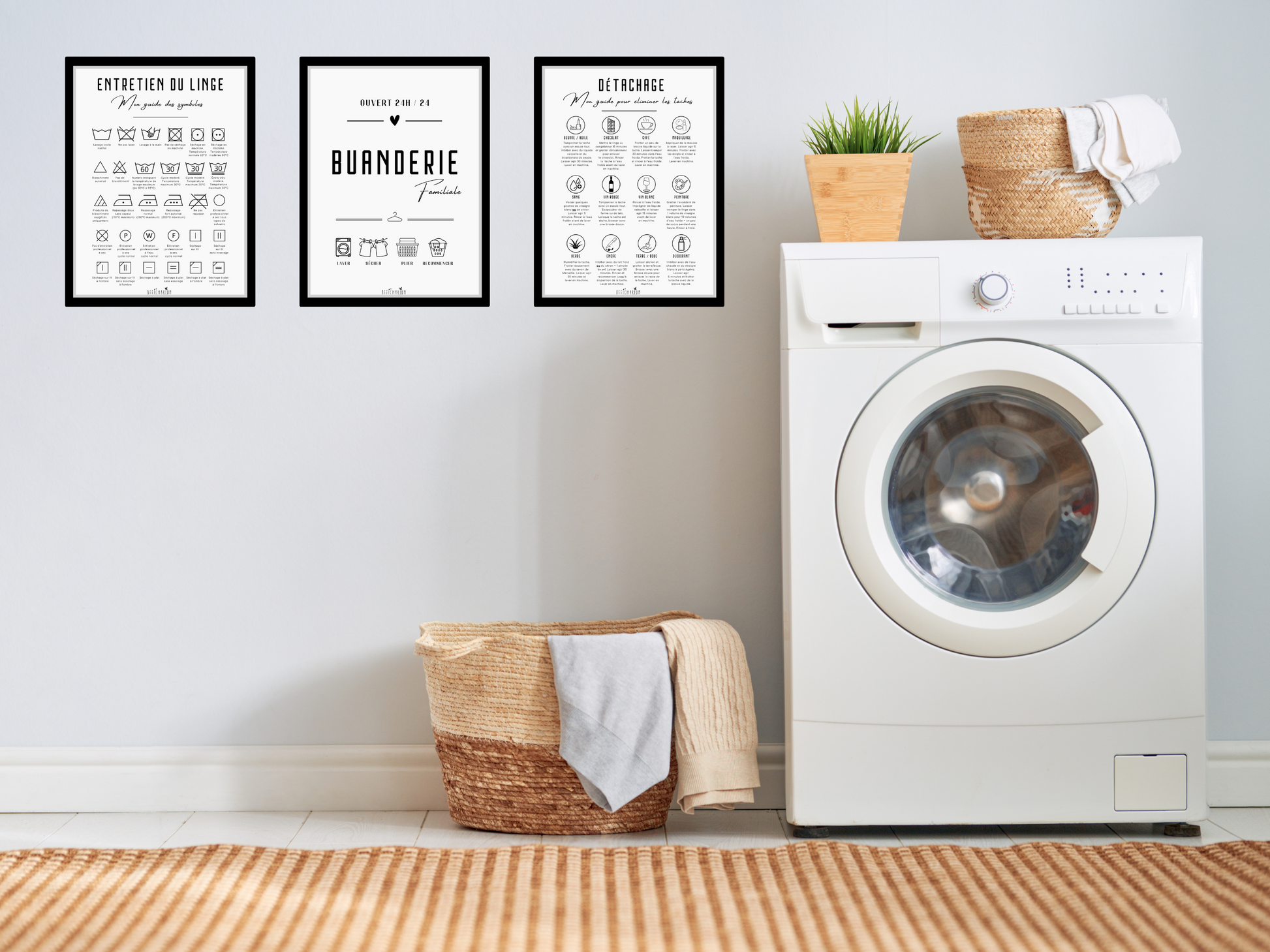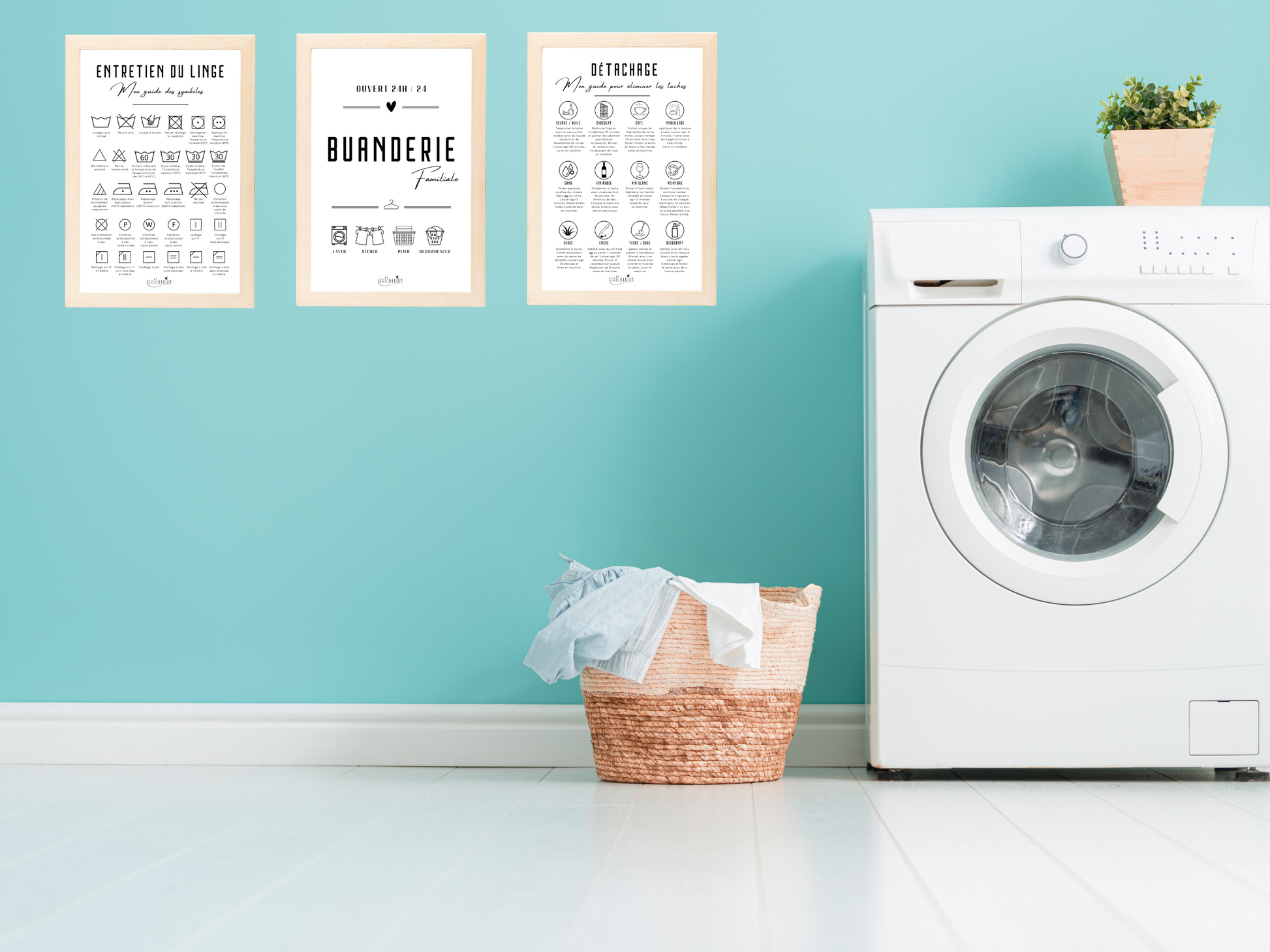 - une affiche décorative "buanderie familiale" contenant les symboles "laver, sécher, plier, recommencer"